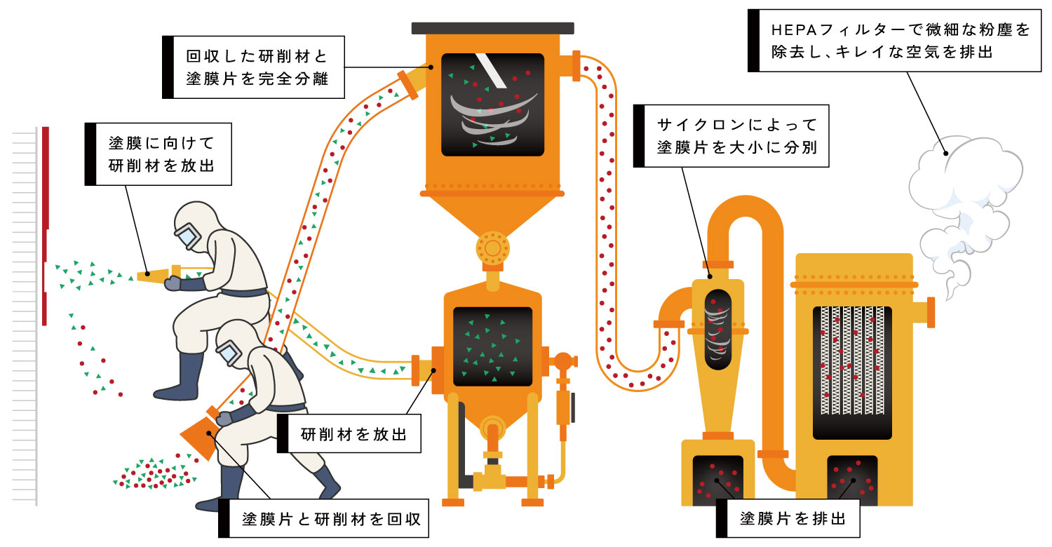 全てのブラスト施工と、研削材の回収までを可能とする工法です。エアーブラストとバキュームブラストの両工法の施工が可能で、最大4名でのブラスト施工も可能です。現場内で産業廃棄物との分離を行い、有害物質を現場外には持ち出さない為、工期短縮と環境にやさしい工法です。