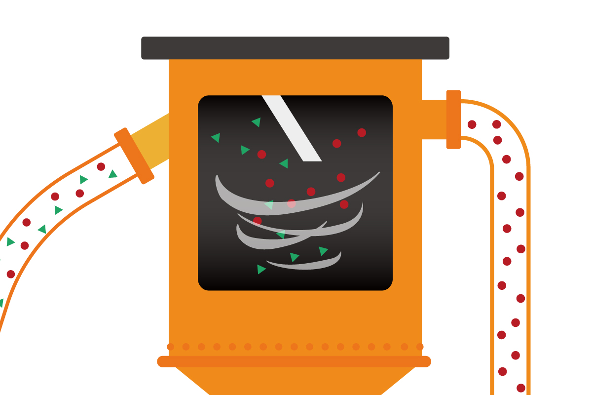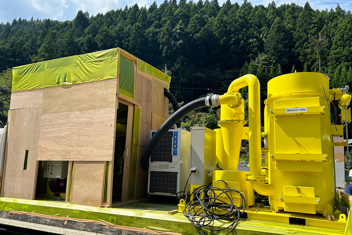 回収した研削材と分離した塗膜はセパレーターにて区分けし、研削材はホッパーに集積して再度加圧タンクに送って循環利用を行う