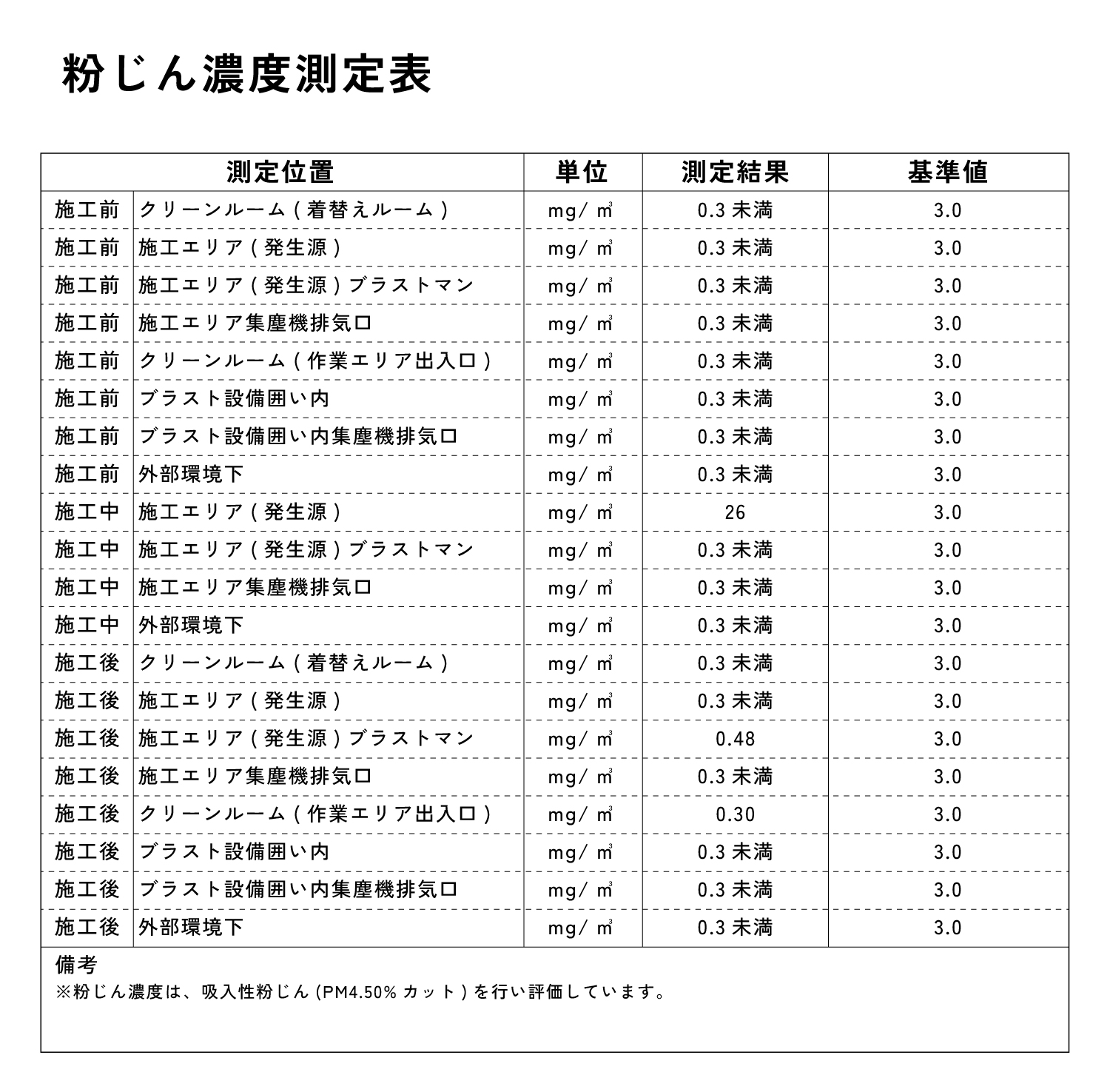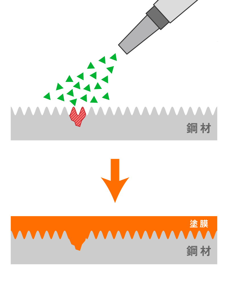 表面を削るだけの2種ケレンでは、内部に食い込んだ錆を除去することは容易ではありません。一方で1種ケレンのブラスト施工では、細かい研削材を鋼材に衝突させるため、内部に食い込んだ錆を除去することが可能です。