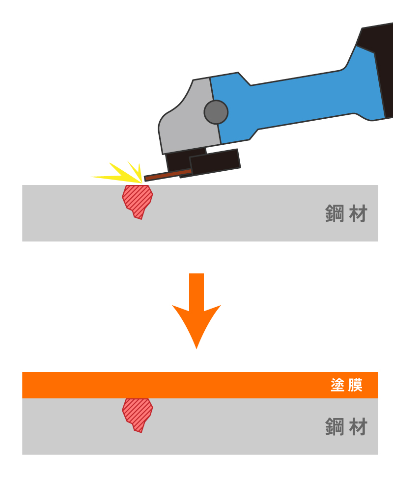研削材は金属系、非金属系どちらも使用できます。あるいは部分的なサビを除去することも可能です。